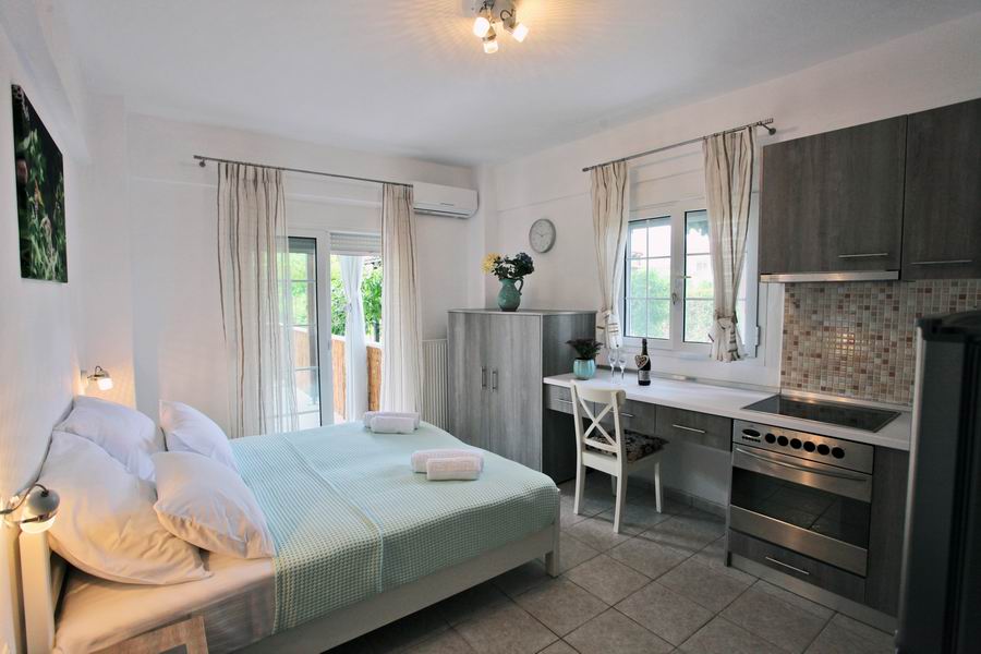 pronájem garsoniéry s TV, klimatizací, trezorem, lůžkovinami a ručníky včetně spotřeby energií a vody, k dispozici je i pračka. Cena dále zahrnuje možnost využití grilu a altánu v zahradě.